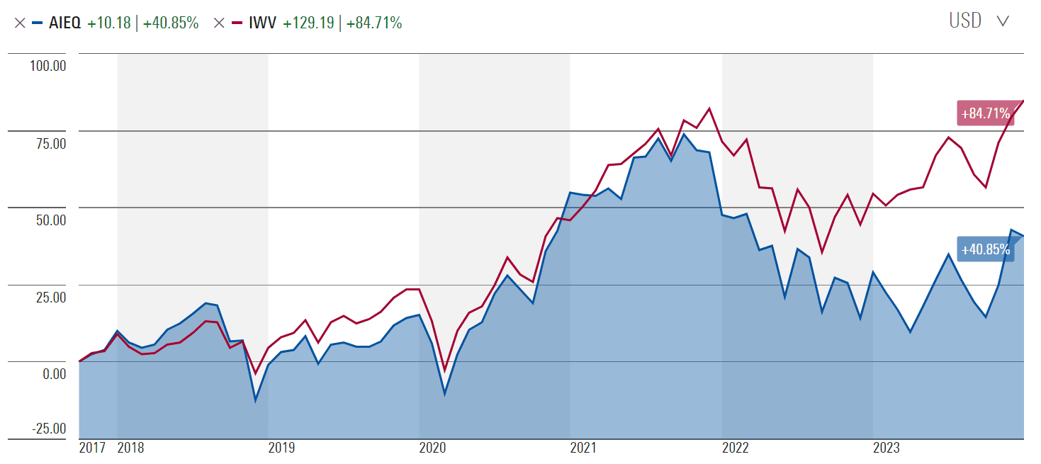 How well has it worked? Here is a chart comparing AIEQ’s return as of this writing since inception with the return of a Russell 3000 index ETF (representing all U.S. publicly-traded stocks):